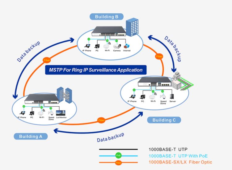 Switch PoE FMC-16GP4GC Cablexa hỗ trợ công nghệ vòng dự phòng và có khả năng tự phục hồi mạnh mẽ, nhanh chóng để ngăn chặn sự gián đoạn và sự xâm nhập từ bên ngoài. Nó kết hợp Giao thức Spanning Tree tiên tiến (802.1s MSTP) và hệ thống đầu vào nguồn điện dự phòng vào mạng tự động hóa công nghiệp của khách hàng để nâng cao độ tin cậy của hệ thống và thời gian hoạt động trong môi trường nhà máy khắc nghiệt. Trong mạng Ring đơn giản, thời gian khôi phục liên kết dữ liệu có thể nhanh đến 20ms.